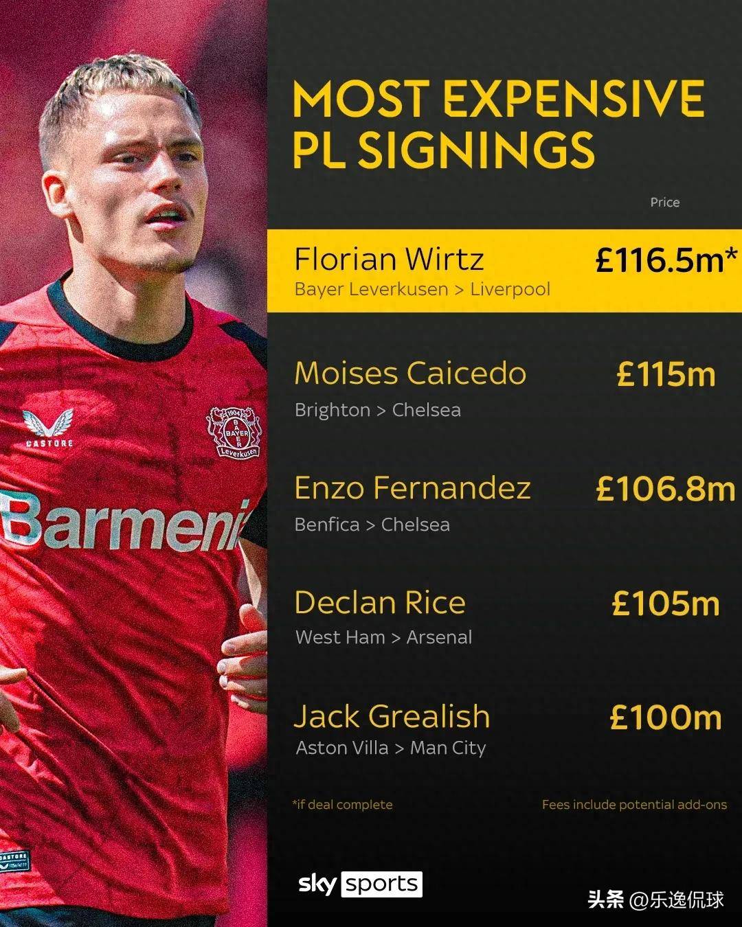 勒沃库森最初的标价为1.5亿欧元,且曾两度拒绝英超冠军利物浦的报价。但最终,利物浦还是以基础转会费1亿英镑达成协议,附加条款可能将交易总金额提升至1.16亿英镑,令维尔茨成为红军历史上的最高转会费球员。