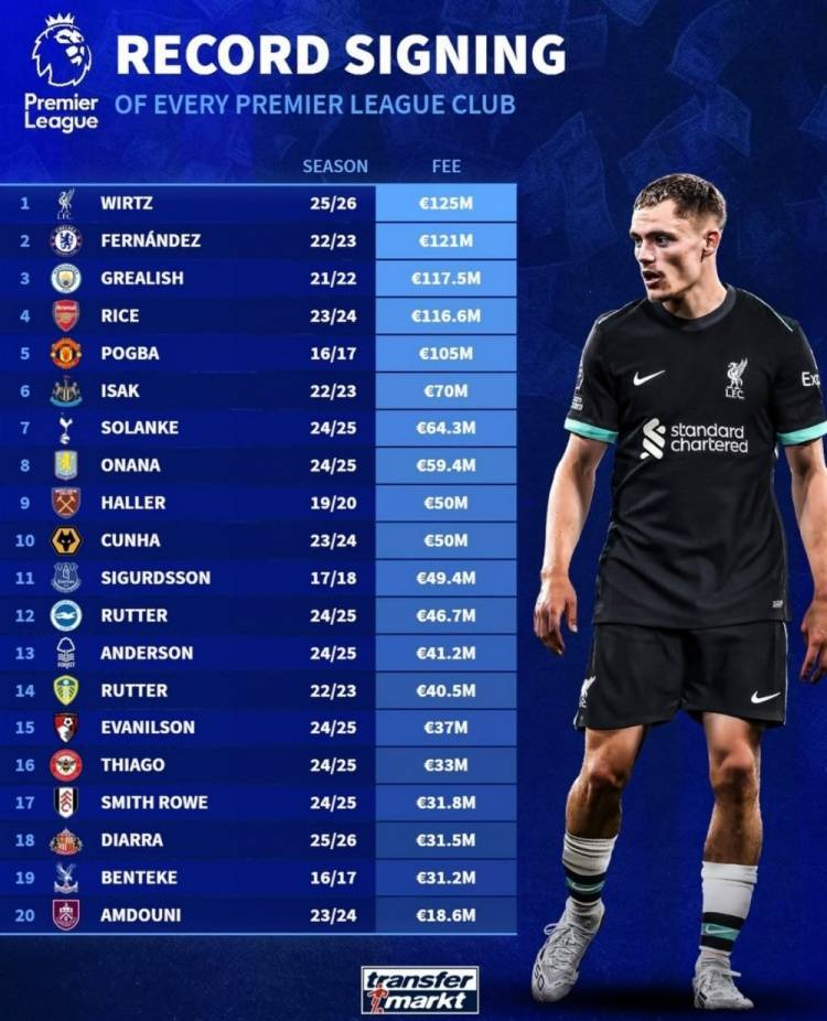 直播吧7月12日讯 德转盘点了英超20支球队队史引援转会费标王,其中维尔茨1.25亿欧领衔,恩佐、格拉利什在列,具体如下: